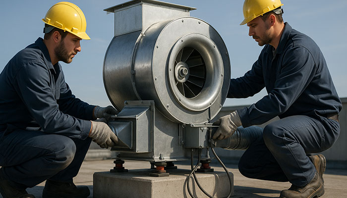 نصب و راهاندازی انواع فنهای اگزاست، سانتریفیوژ و جتی، شامل تراز مکانیکی، نصب لرزهگیر، اجرای اتصالات فلکسیبل، و اتصال به سیستم کانالکشی.